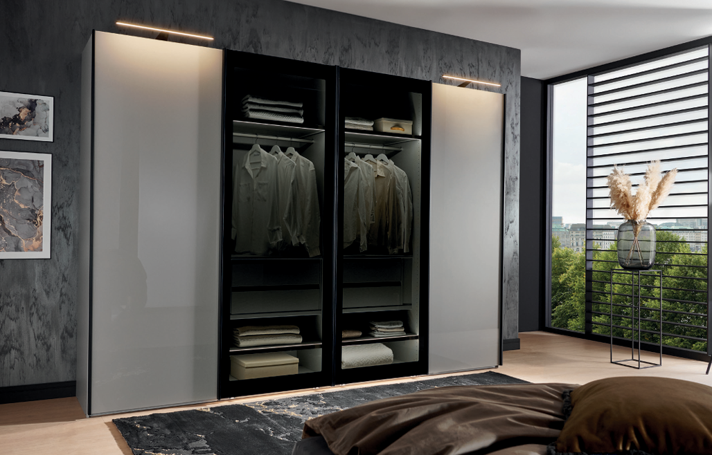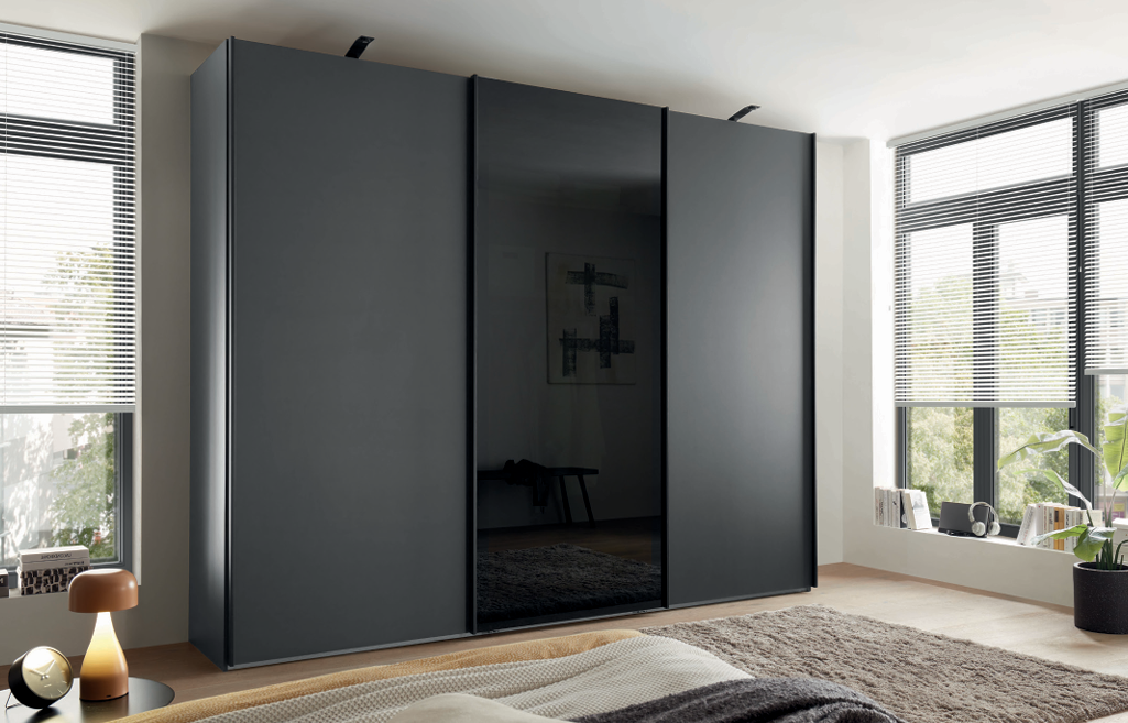 German engineering for your bedroom...The Dubai "VIP" wardrobe range. Turn cloths storage into a statement with this hyper modern range, available in sliding and hinge variations. Featuring transparent black glass to add a sense of sophistication and allure to any bedroom. Being part of the "VIP" collections, Quito comes in standard height 216cm or tall height 236cm and is finished with the signature blue/grey pinstripe interior.