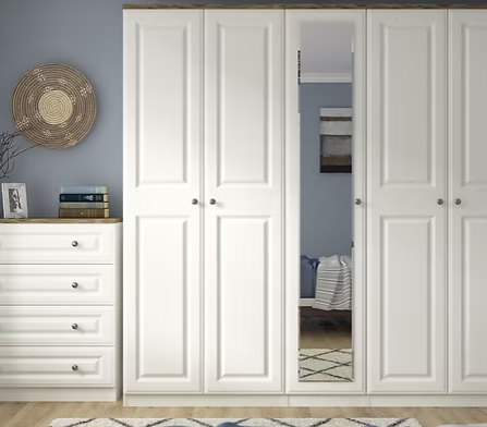 Expertly manufactured in England, this hinged-door wardrobe collection is available in two finishes with a selection of widths and complementary chests/bedside units designed to complete the ensemble.