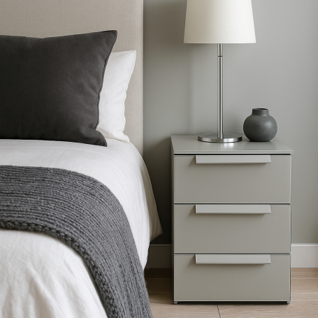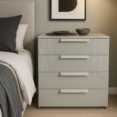 Miramar comes in four colours. A matt colour for the sides (carcase) and a glass finished colour for the door and drawer fronts.